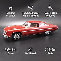 A SUPER SMOOTH 3 in 1 KIT: MPC’s 1/25 scale 1976 Chevy Caprice is the perfect project for builders who are looking for options. Add it to your collection today! LOADED WITH GOODIES: The 1976 Caprice is fully paintable and features an ALL NEW, authentically detailed, water-slide decal sheet—full of colorful options. Build this smooth cruiser one of three ways: stock, security vehicle or hauler. Features include: west coast mirrors, V8 engine, functional tilt-bed trailer with custom wheels, radio antenna, flasher light, pursuit light, pad printed whitewall tires and more. Wrapped up nicely in NEW vintage-style packaging! QUICK SPECS: 1/25 Scale, 85+ Parts, car assembles to 9 inches long (18 inches long with trailer added). Parts molded in white, clear and transparent red with black vinyl tires. Some parts are chrome plated. Plastic model kit paint and cement required (Testors or Tamiya brands recommended). Paint guide included in kit. Skill Level 2. For ages 10+ THE PERFECT PRESENT: Don't know what to get dad for his birthday? Or maybe you have an avid hobbyist or collector in your life. This model kit makes an ideal gift for any occasion!