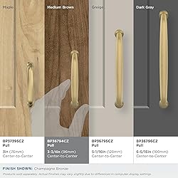 Traditional style cabinet pull adds a sophisticated, classic touch to cabinets, drawers or furniture and has an overall length of 4-7/16 inches with a 3-3/4 inch center-to-center measurement between mounting holes Champagne Bronze cabinet handle delivers a warm, elegant style with a soft, sophisticated gold tone that coordinates with top plumbing and lighting brands for a timeless, seamless look Made with high-quality zinc, this Amerock cabinet pull features detailed craftsmanship and offers exceptional durability for long-lasting reliability you can trust Premium quality cabinet hardware pull comes with mounting hardware for easy, hassle-free installation Backed by a limited lifetime warranty ensuring qualiy craftsmanship and material integrity