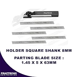 - The PRAZTECH Mini Lathe Cut-Off Tool Set features an 8mm square shank holder, six M2-grade HSS blades (1.45 x 5 x 63mm), and an Allen key. Heat-treated and precisely machined, the holder ensures rigid clamping and supports the blade over a wide area to prevent breakage. With a tool center height of 11.06mm, it's ideal for small lathes like Unimat and Emco, making it perfect for industrial, mechanical, and DIY applications.