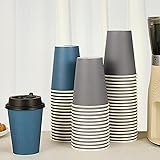 Value Pack: You will receive 50 packs of blue coffee cups and 50 packs of gray coffee cups, and 100 packs of black matching cup lids. Perfect for home, office, restaurant and party use Widely Use: Our 12 oz coffee cups with lids are suitable for both hot and cold drinks, they are great for storing cold/hot coffee, tea, water, juice, and more; You can use these coffee cups in offices, cafes, stores, kiosks, cars, and many more places Leak Proof and Durable: We designed the lid to form a tight seal with the rim of the cup to help prevent leaks and spills, the coffee cups with the lid will keep your hot coffee cups, but not burn your hands Safety and Health: Our disposable paper cups can be discarded directly after you have used them; Give up your disposable plastic cups, the substances produced when plastic cups are filled with hot drinks are harmful to your health Two Color Set Design: Each hot paper coffee cup is printed with saturated color to make the disposable cups look more unique and sophisticated, and the style of these paper cups with lids can be ideal for any occasion