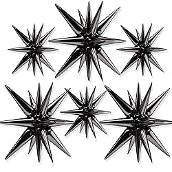 - PartyWoo Black Star Foil Balloons 6pcs Different Sizes Pack of 27 22 Inch Large Black Starburst Spike Mylar Balloons for Graduation Birthday Retirement Anniversary Space Theme Party Decorations