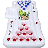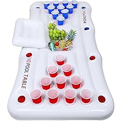PREMIUM FLOATING ACTIVITY CENTER: Crafted from heavy-duty PVC, this 72" x 31.5" inflatable game table features 28 color-coded cup holders (14 blue/14 red) arranged in dual triangular patterns and side rows. A central 15.7"x11.8" cooler with lid keeps snacks fresh during water games. VERSATILE WATER ENTERTAINMENT: Perfect for floating toss games or creative challenges, this 200lb-capacity raft stays stable on water. Ideal for group activities at pools, lakes, or beaches. Game accessories sold separately. SMART COOLER DESIGN: Integrated shaded compartment protects snacks and beverages from sun exposure. Sized to fit standard drink cans and small containers, keeping refreshments cool throughout daytime use. TRAVEL-READY: Quick-inflation valves work with any pump (electric/hand). Reinforced seams resist leaks when properly maintained. Tip: Avoid over-inflation and store flat after drying. ALL-DAY POOL LOUNGE: Doubles as a comfy floating seat or sunbathing pad. Compact foldable design fits in carry bags for vacations, resort trips, or backyard fun. Includes emergency repair patches for on-the-go maintenance.