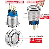 - Package include : 2* Push Button Switch 2* Wire Connector Sockets What's Latching Switch: Latching switch: Push it, ON; Push it again, OFF. What's the Wire Connector: With the wire connector, you don't need to solder the terminals, make installing very easy Saves the issue of soldering to the switch, and possibly melting it as well You can replace the switch anytime by just unplugging the switch from its socket Wide Application: Our switch can be used as a switch for various additional electric equipment, inside and outside the car. AC or DC enviroment. It is widely used to control LEDs and circuits on Car, RV, Marine Boats, Trucks, Households, Coffee Machine, Industrial Equipment and Medical Equipment. Suitable for almost any motorized vehicle of motor starting, power starting devices, and can also be an access control button. What's Note: -These switches come with a rubber O-ring which makes them splash resistant but they can NOT be submerged underwater -The project you are going to be used for, don't let current go above 5 amps. Or the switch will get warm and to be burned out What's Customer Support: If you have any questions, feel free to contact us by E-mail any time. We get professional customer service staff and technician to help you Specifications: Head diameter: 0.98" (25mm) Mounting hole size: 0.87" (22mm) Switch combination: 1NO1NC SPDT Switch rating: 5A/250VAC, 5A/30VDC LED rating: 15mA, Using AC/DC LED lamp, the terminals have no difference of anode and cathode Head shape: Flat Enclosure material: 304 Stainless Steel Protection level: IP67, IK10