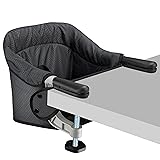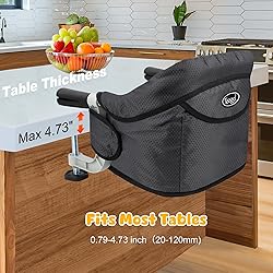 - Description: Patented table chair for babies to eat with the family, safe structures to prevent babies from standing up to fall down and slip down. Features: * Convenient operation: Only 20 seconds to finish quick installation or dismantlement * Convenient travel: As a space-saving and light-weight chair, it's the real choice for you and your baby to make a free journey with it * Easy cleaning: Removable fabric and seat pad, free cleaning by washing machine, no fabric crack * Easy storage: 1 second to finish folding the left and right arms inward, then put it into its storage carry bag, that's all * Not damage tables: Non-slip support handrails, not mark tables or pinch fingers Product Specifications: * Color:Black * Fabric: 600D Waterproof Polyester Fabric * Assembled Dimensions: 13.8 x 11.8 x 11 inch (L x W x H) * Folded Dimensions: 13.8 x 11.8 x 2 inch (L x W x H) Package Include: * 1 x Hook on Chair * 1 x Carry Bag * 1 x Instruction Manual Usage Note: For children from 6 to 36 months Care and Maintenance: Fabrics can be hand-washing and machine-washing, hang dry. Important Note: Check your table thickness and table lips offset dimensions before ordering, ensure your table is compatible before using.