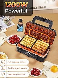 【 3-IN-1 Sandwich Toaster】Not only a sandwich maker. With 3 kinds of Interchangeable plates (sandwich, waffle and grill plates), it can also cook waffles, french toast, steak and vegetables, allowing you to enjoy your favorite food ! 【 Independent ON/OFF Button】5-gear temperature control, which allows you to choose the right temperature to cook food perfectly. When the knob is turned to "0", the waffle maker is off and you don't need to unplug. 【Cooking Finished in Ten Minutes】1200W powerful power heats faster than most waffle makers. Preheating can be completed in 3-4 minutes, and two waffles can be quickly cooked with crispy outside and tender inside in 5 minutes, No need to wait long time. 【Detachable Non-Stick Plates Easy to Clean】The 3 sets of plates are coated with a non-stick layer, which is not easy to stick to food, and can be cleaned quickly with water or in the dishwasher. If you have any question about our product, just feel free to contact us. 【Durable and Safety Design】Designed with heat-resistant handles, latch and non-slip feet, which make the operation more convenient and safe. The sandwich maker can be stored upright in the cupboard , small and does not take up space.