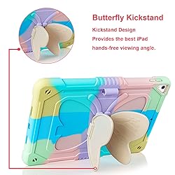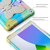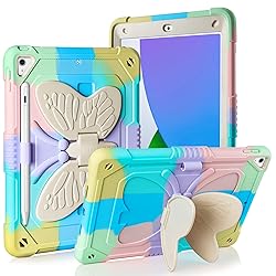 Compatibility: The tablet case compatible with iPad 9th Generation 2021 released (Model Number:A2602/A2603/A2604/A2605), compatible with iPad 8th Generation 2020(A2270/A2428/A2429/A2430), compatible with iPad 7th Generation 2019(A2197/A2200/A2198).Check the model on the back of the tablet, please confirm the model before placing an order Built in Pencil Holder and Butterfly Stand: for iPad 9th generation cover built-in pencil holder allows you to store and carry your pencil easily. The vivid butterfly stand design frees your hands and makes your tablet unique. Adjust the best angle to watch the video, working and typing. (Pencil is NOT included!) Double-Layer Military Grade Protection: Military grade drop tested case protects your tablet from all angles. Shockproof/Drop-proof/Impact resistant/Scratch-proof. Premium Soft silicone rubber and hybrid hard PC and front hard PC bumper 2 in 1 design Screen and Camera Protection: Extra raised lips and corners of the front hard frame provide super protection from drops, keep your screen and camera safe. ( Note: There is no screen protector on the front cover of this case) Outstanding Quality and Colorful design: Precisely cutouts allow quick and easy access to all ports, buttons and sensors etc. For iPad 7th generation case with rainbow colors is perfect gift choice for women, girls and kids