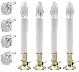 - Creative Hobbies Electric Window Candles are great for centerpieces, window candles, weddings, restaurants, table decor, party decorations and home decor. These dusk to dawn electric window candles go on when dark and go off when light out. Long lasting and reusable with attractive brass plated metal base! Extra long 6 foot white power cord with fused and polarized safety plug. (Extra fuse included on cord). Brand new in color box with light bulb installed ready to use. If using in a window place the sensor eye in the window facing the outside light (sensor is opposite the side where the cord exits). Use the included suction cup holders on any window and even use them on windows without sills. You won’t have to worry about your candle falling off! Your candles won’t get knocked down by pets or passersby because they will be secured directly to the window. No need to worry about your candles getting broken. Comes with 4 of each candle, bulb and window clip!