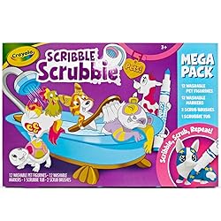 CRAYOLA SCRIBBLE SCRUBBIE PETS MEGA PACK: Animal Toy Set includes 12 Washable Animal Figures, 12 Washable Markers, 1 Scrub Tub, 2 Scrub Brushes, and an Instruction Sheet. COLOR, WASH & PLAY: Color and customize these collectible animal toys then wash them and start again. GROW YOUR COLLECTION: For more animal friends, collect additional Scribble Scrubbie expansion packs (sold separately). WASHABLE MARKERS: Crayola Ultra Clean Washable Markers wash from skin, most washable clothing and most painted walls. Features 12 non-toxic colors. GIFT FOR KIDS: Give this set as a great birthday or holiday gift for girls and boys ages 3 and up! GENERAL NOTE: We suggest using only Crayola Ultra-Clean Markers for your Scribble Scrubbie Pets.