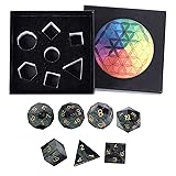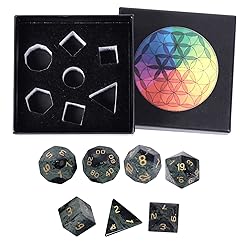 - DND Dice Set for Dungeons and Dragons Role Playing Game(RPG), D&D, MTG, Pathfinder, Table Games, Reiki Healing and Decoration, with Black Chakra Box and Velvet Bag. Size of Each Dice: Polygon(2 pcs): 0.7 inch in height, 0.82 inch in width; Tetrahedron: 0.55-0.62 inch in width; Rhombus: 0.86-0.94 inch in length, 0.62-0.7 inch in width; Triangle: 0.7-0.78 inch in height; Decahedral(2pcs): 0.82-0.98 inch in length, 0.82 inch in width; Total weight is about 84-87gram per pack. Package Includes: 1 x D20 1 x D12 2 x D10(one 00-90, one 0-9) 1 x D8, 1x D6 1x D4 1 x Gift Box 1 x Grey Velvet Bag Pls Note: Our dice are made from stone, the color and texture of the stone may vary, and when we took the photos, we put the dice under professional strong lighting to show the natural beauty of the gem, depending on your screen, the colors of the stones may be slightly different than the pictures.