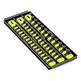 Universal twist-lock socket set organizer tray with 3 socket rails Perfect for storage in the drawer, on the bench, or on the go: holds 40 sockets Twist-Lock clips keep sockets secured for transport and prevent tool loss. Sockets are loaded with the drive end down. Includes 40 Twist Lock Clips; 15 - 1/4", 14 - 3/8" and 11 - 1/2" drive size. Socket rails are locked in the tray for security and unlock with the push of a button Includes I.D. stickers for socket identification