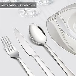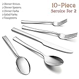 SET OF 2 - E-far 10pcs stainless steel silverware set includes 2 of each: Dinner Fork, Dinner Spoon, Dinner Knife, Salad Fork, Teaspoon, Proper size and weight MATERIAL - Solid made of high quality 18/0 stainless steel, Rust resistance and nickel free, Healthy and durable for daily use, Easy clean and dishwasher safe CRAFTED - Smooth edges with no rough spots, Mirror polish surface keeps shiny, Specially designed sharp serrated dinner knives’ blades for cutting meats easily MODERN - Contemporary design with square edge ends, Simple and classic flatware blends with many dinnerware, Elevate dining experience with decent eating utensils VERSATILE - Sturdy cutlery sets are perfect for home, restaurant, hotel, Suitable for wedding, travelling, camping, party, catering, Also as a decent gift for family and friends