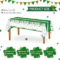 - Features: Keep your table clean: These Irish table covers have smooth and waterproof surface, which can protect your table from pilled milk, juice or soda, crayons, markers, glue and more. And prevent scratches from tableware, like dining forks, crayons, markers, glue, etc. Multi functional: These rectangle green tablecloths are designed with lucky shamrock patterns, aim to create warm party atmosphere, will be stylish decorations for themed Irish parties and events Specification: Material: plastic Size: 54 x 108 inches/ 137 x 274 cm Color: green and white Package includes: 3 x St Patrick's Day tablecloths Warm notes: Manual measurement, please allow slight errors on size. The colors may exist slight difference due to different screen.