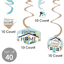 - Take your New Sweet Home to the next level when you add Welcome Home Housewarming Decoration Swirls. This set of 40 is professionally printed and double-sided on heavy-duty cardstock paper and all swirls hang below an accordion-style spiral with included clear hooks. Show your creative side when you decide to hang Party Decoration Swirls high or low throughout your party space. Party Decoration Swirls are your go-to party decorations to help you become a party-throwing hero.