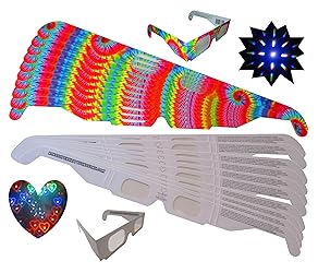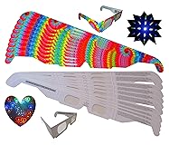 Includes 25 trippy tie-dye glasses (starburst effect) and 25 rainbow hearts glasses (heart halo effect). Rainbow Hearts glasses have plain white exterior frames and display beautiful hearts around points of light in darkened environments. 10 standard fireworks glasses and 10 Rainbow Hearts fireworks glasses. Perfect for glo parties, EDM and Rave Events, Wedding Receptions, Holiday Lights, City Lights, Even the Moon and Stars. Also known as Diffraction Glasses, Firework Glasses, Firework Show Glasses, Holiday and Christmas Light Glasses, Light Wave Glasses, Science Class, Festival Glasses, Rave Glasses, Laser Glasses, LED Gloving Glasses, Orbit Light Show Glasses etc. Lightweight paperboard frames are easy to take wherever you go!