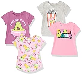 CLASSIC FIT: A classic semi-fitted, comfortable silhouette that skims the body COTTON JERSEY: Cut from light-weight cotton jersey with natural stretch and breathability, making for a comfortable and soft wardrobe staple. EVERYDAY ESSENTIALS: Short-sleeve crew neckline t-shirts cut with a slight a-line silhouette for everyday wear. Perfect go-to layer for your child's wardrobe. DETAILS: Printed tag at neckline, mix and match styling. Some packs feature items with ruffle sleeve details, mini chest patch pocket, or dropped back hems. Styling details vary by pack. See pictures for more specifics on items offered in each pack. OFFICIAL LICENSED PRODUCT: Amazon Essentials offers one-of-a-kind products featuring your favorite characters to add wonder to your wardrobe! All products are officially licensed and designed in-house.