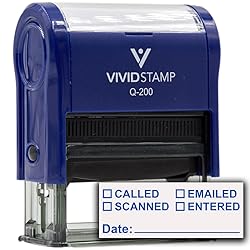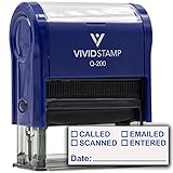 - The Vivid Stamp [] Called [] Scanned [] Emailed with Date Line Self-Inking Office Rubber Stamp is a versatile tool for efficiently tracking multiple actions on documents in office and administrative settings. Designed with a durable plastic body and a precision cut rubber text plate, this stamp provides clear, consistent impressions to help keep records organized and easy to follow. Its self-inking mechanism includes a re-inkable stamp pad, allowing for quick ink refresh without replacing the entire unit. Available in three practical sizes, it works well on a variety of documents, from small forms to full-size reports. Ink color options include red, blue, and black, offering flexibility to match your workflow or filing system, while the stamp body comes in a variety of colors for easy identification in shared workspaces. The ergonomic shape and smooth press action ensure consistent, even impressions with minimal effort. Ideal for offices, administrative teams, and businesses, this stamp helps streamline document handling and track multiple actions with ease.
