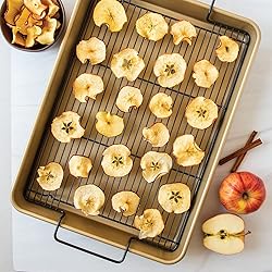 A high-sided nonstick half sheet, for pot-luck sized portions of cakes, lasagna or bars, with a black non-stick rack insert for making jerky, dried fruits, crisp fries, roasts, perfect oven-baked bacon and more Aluminum pan distributes heat quickly and evenly, made to last and never rust. And rack features easy-to-grip handles and doubles as a cooling grid for baked goods. Features premium gold non-stick inside and out for easy cleaning and a steel reinforced rim for extra strength A healthier option to traditional frying, the pan catches drippings and the nonstick coated steel rack elevates food while the hot air circulates underneath so there's no need for turning foods Made in America of domestic and imported materials and components.