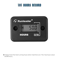 - Runleader HM006B Digital Inductive Hour Meter, Maintenance Reminder, Built-in CR2430 battery,100% Epoxy Resin,Waterproof Design. Product Features: HOURS ■Display the engine total running hours when detect the working signal. ■Total hours will help to schedule the nessessary maintenance purpose. ■TOT hours are non-resettable. ■Hours read up to 999,99 hours,accuracy 0.1/1 hour. SPECIFICATIONS ■ LCD Screen size:0.93X0.4 inches ■ Product size: 2.13x1.46x0.6 inches ■ Weight:0.095lb ■ Easy to install, including double-sided tape, cable tie, Instruction manual,2 screws,signal cord. ■ Waterproof rating: IP68.