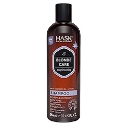 - Cancel out unwanted warm, brassy tones with the HASK Blonde Care Purple Toning Shampoo. This highly pigmented, violet formula gently cleanses while neutralizing dull, yellow and brassy tones for a cooler shade of blonde. Enriched with a blend of elderberry oil and vitamin C* to help enhance shine, restore moisture and keep dry, damaged hair smooth and healthy-looking. Package made from post-consumer recycled plastics. Please recycle.