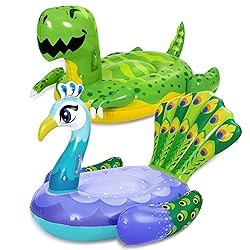 - Sloosh 2 Pack Inflatable Dinosaur & Peacock Pool Floats Set, Fun Beach Floaties for Swim Party Toys, inflatable island, Summer Pool Raft Lounge Ride On for KidsSUPER VALUE & UNIQUE DESIGN . Our inflatable pool Floats include 2 Packs of Inflatable Dinosaur and Peacock Pool Floats. The Dinosaur is 51" x 35" x 29" and the Peacock is 49" x 41" x 34". On a hot summer day, These Pool Floats can bring a lot of smiles to your pool and beach activities. This is a great swim toy for kids to ride on. Dual handles also provide the balance and safety to ride.SUPER VALUE & UNIQUE DESIGN . Our inflatable pool Floats include 2 Packs of Inflatable Dinosaur and Peacock Pool Floats. The Dinosaur is 51" x 35" x 29" and the Peacock is 49" x 41" x 34". This is a great swim toy for kids to ride on. Dual handles also provide the balance and safety to ride. On a hot summer day, dinosaur & peacock pool floats can bring a lot of smiles to your pool and beach activities.EASY TO USE. Our inflatable swim floats lounge can be easily inflated and deflated in a short time by pump (pump not included). Allows for simple foldaway, convenient storage and portability whether you're spending the summer day at the beach, or at your pool in the backyard. Seasonal merriment: Great dinosaur & peacock pool float, pool toys for kids Seasonal merriment, summer pool parties decorations. You can put it at a pool/beach/sea/swimming party and your child will have hours of fun with their dinosaur float and peacock inflatable companion.PREMIUM PVC QUALITY: Made of high-quality PVC, thicker material delivery better quality and more durable than any other products in the market, tear resistant, and UV fade resistant.EXCEPTIONAL CARE: We're big on the little things. That's why customer safety and satisfaction are at the heart of everything we do. Contact us if products don't meet your expectations. We look forward to ensuring every moment brings you joy. The celebrations start at JOYIN!