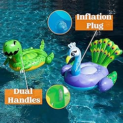 SUPER VALUE & UNIQUE DESIGN . Our inflatable pool Floats include 2 Packs of Inflatable Dinosaur and Peacock Pool Floats. The Dinosaur is 51" x 35" x 29" and the Peacock is 49" x 41" x 34". This is a great swim toy for kids to ride on. Dual handles also provide the balance and safety to ride. On a hot summer day, dinosaur & peacock pool floats can bring a lot of smiles to your pool and beach activities. For ages above 36 months. EASY TO USE. Our inflatable swim floats lounge can be easily inflated and deflated in a short time by pump (pump not included). Allows for simple foldaway, convenient storage and portability whether you're spending the summer day at the beach, or at your pool in the backyard. Seasonal merriment: Great dinosaur & peacock pool float, pool toys for kids Seasonal merriment, summer pool parties decorations. You can put it at a pool/beach/sea/swimming party and your child will have hours of fun with their dinosaur and peacock inflatable float companion. PREMIUM PVC QUALITY: Made of high-quality PVC, thicker material delivery better quality and more durable than any other products in the market, tear resistant, and UV fade resistant. EXCEPTIONAL CARE: We're big on the little things. That's why customer safety and satisfaction are at the heart of everything we do. Contact us if products don't meet your expectations. We look forward to ensuring every moment brings you joy.