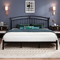 Radiate Elegant Appeal: A minimalist crown shape, steeped in luxury, transforms your room into an antique, romantic sanctuary. It commands attention in any bedroom Spacious Storage Options: With a generous 12" clearance beneath, it offers ample space for storing shoes, seasonal clothing, and luggage Strong and Durable: Crafted from a sturdy metal structure with a capacity of up to 1000 pounds, metal slats prolong mattress life and ensure stability. The powder-coated finish provides rust and wear resistance Considerate Features: Fluorescent strips illuminate in the dark to prevent toe stubbing, while the bed frame's rounded corners add a touch of safety and reassurance Effortless Assembly: Complete with installation tools and clear instructions, it can be assembled in just 20 minutes, making it a breeze even for DIY novices