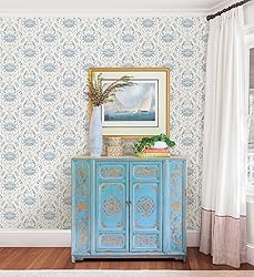 Coastal inspired peel and stick wallpaper with a blue crab damask print Peel and stick to apply, pull up to remove NuWallpaper is safe for walls and leaves no sticky residue behind Easily repositionable while installing NuWallpaper sticks to any smooth, flat surface—perfect for DIY projects Ideal for rental or home decorating Comes on a 20.5-in x 18-ft roll and covers about 30.75 sq. ft. Design repeat of 10.25-in This product should NOT be applied to textured walls – smooth clean, dry, painted surface only (no Non-Stick paint or soap residue)