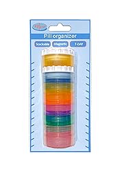 - EFFICIENT PILL ORGANIZER: 7-day weekly pill organizer is designed for storing pills, supplements, or vitamins for a weekly regimen. It has seven separate compartments, perfect for organizing medication for an entire week.For flexibility and convenience, this set comes with an extra lid, letting one divide up compartments into two stacks or to carry just one separate compartment at a time.Also included are two magnetic adapters, rendering the pill organizer attachable to a magnetic calendar board or any magnetic surface. All compartments and both lids are semi-transparent. MAGNETIC: This pill organizer has an embedded magnet and can fit to magnetic surfaces (e.g. a fridge or a calendar) to ease your daily schedule and to visually track your medication or supplement regimen. PORTABLE: Keep the pill dispenser in your pocket, purse, or backpack. Each compartment size is about 1.57 x 1.57 x 0.78 inches Material: medical grade plastic. CLEANING: Wash or sanitize before initial use and allow dry completely before using. WARNING: This product is neither child resistant nor a toy. The pill compartment’s closures are not child resistant. Keep it out of the child’s reach. Package includes: One 7-Day stackable pill organizer with one magnetic adapter and one lidOne additional small pill dispenser with one magnetic adapter and one lid compatible with 7-Day stackable pill organizer