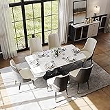 Perfect Fusion of Modern Simplicity & High-end Design: This dining table creates a modern minimalist style and high-end atmospheric appearance through the combination of different materials.The unique design of the X-shaped base complements the natural texture of the matte white rock slabs, enhances the overall beauty of your home space. Its understated elegance allows it to effortlessly complement a variety of dining room styles. Excellent Stability & Durability: The modern sintered stone kitchen table top can offers better exceptional resistance to scratches and heat than faux marble dining table top. It won’t be a problem if you put any hot things on it. In addition, the solid A3 carbon steel construction of the X-shaped base provides excellent stability with a high load-bearing capacity, and it ensures that the table is not prone to wobbling during prolonged use. The combination of the two provides you with the best use experience, ideal for dining and hosting parties. Easy 2 Steps Quick Assembly: This rectangular dining table is designed to be easy to assemble, with clear installation instructions that can be completed in just 2 steps, allowing you to quickly set up the table and share unforgettable meals with family and friends. Easy to Clean: The matte sintered stone dinner table does not show smudges and fingerprints easily, making it easier to clean; the base is plated and acid-washed to resist corrosion and require less frequent maintenance. This modern dining table reduces the workload of daily cleaning and improves the long-term durability of the furniture, which is a great choice for busy you. Guaranteed Safe to Use: The dining table is made of safe materials that meet environmental standards for direct food contact. In addition, this dining table has professionally polished rounded corners, thoughtfully designed to prevent collisions and ensure your dining safety. Adaptable to A Wide Range of Styles: Whether it's modern minimalist, industrial, or any other home style, this dining table will go perfectly with every style. You can choose the appropriate style and size for your personal home environment and use it for hosting family dinners and entertaining guests.