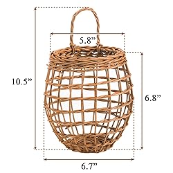 𝐓he overall dimensions of the onion basket are 𝟔.𝟕" in width, 𝟏𝟎.𝟓" in height. 𝐄xcluding the handle, the height is 𝟔.𝟖", with an opening diameter of 𝟓.𝟖". 𝐏lease note the basket is compact in size. 𝐖e recommend checking the size (𝐅ig. 𝟐) and hand-held reference image (𝐅ig. 𝟑) before purchasing. 𝐓hank you for your understanding. 𝐍atural 𝐌aterial: Crafted from 100% natural wicker, these hanging baskets are carefully hand-woven to create a sturdy storage solution. Natural rattan ensures fruits, vegetables, and other fresh produce are kept in a safe and breathable environment. 𝐁reathable 𝐒torage 𝐃esign: Crafted with an open-weave structure, these hanging baskets promote optimal air circulation to keep your onions, garlic, and potatoes well-ventilated and fresh. Both the top rim and base feature reinforced woven construction for enhanced strength and long-lasting use. 𝐑ustic 𝐂harm: With their authentic boho-chic aesthetic, these woven baskets effortlessly enhance vintage, farmhouse, or rustic interior styles. The natural texture and earthy tones bring warmth and character to any space, creating both functional storage and attractive decor. 𝐕ersatile 𝐎rganization: Ideal for storing onions, potatoes, garlic, and seasonal fruits like apples and oranges in your kitchen or pantry. Beyond the kitchen, they also work wonderfully for organizing household items, crafts, or bathroom essentials throughout your home.