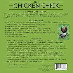 - TIPS FOR USE While each hen reacts differently to the sensation of an object on her back, many will attempt to flee from it. Attaching the Hen Mating Saddle is best done at night. Sleeping with the saddle on allows the hen time to become familiar with the sensation. Unfasten saddle’s snaps then get hen from roost. From a seated position, place hen in lap with head facing you and legs dangling between yours. Rest her keel on your lap without squeezing her body. Hold legs securely by squeezing gently between yours. Place saddle denim side down on hen’s back allowing elastics to drape over top of wings alongside her neck. While holding end of first elastic, lift one wing slightly and bring snaps to meet on underside of saddle. Secure both snaps. Repeat procedure with second elastic on opposite side. Return hen to roost. Saddle should be worn continuously until feathers have re-grown. Hens are able to dust bathe and preen normally while wearing a Hen Mating Saddle.
