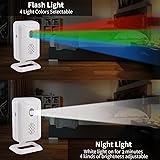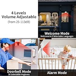 ✅【5 Modes Available】Not only serves as a motion sensor to detect alert but also has more other functions. With wireless motion sensor alarm various modes, it can also serve as a welcome message, alarm, doorbell, colorful light, and night light, 5 in 1 automatic door chime. Color/Red/Blue/Green, distinguish multiple entrances by different light colors. The door chime is a versatile and practical device that offers a range of features to enhance your home or business's security and convenience ✅【Melodies & Volume Adjustable】The receiver is a doorbell design with 36 ringtones and 5 welcomes doorbell sound for personal preferences. 4 levels volume adjustable(Loud/ High/ Middle/ Low ) from 113~25dB. Color light/ Lighting mode is silent and has 4 levels of brightness adjustable, great for people with hearing disabilities or there is sleeping baby in your house. The color light model also has 4 colors selectable. There are 4 levels of volume adjustable in welcome/doorbell/alarm mode. ✅【Sensitive & Wide Wireless Range】Motion sensor alarms with wide wireless range can communicate with other devices over a larger distance. The motion sensor catches movement from a broad scope of space, with working long-range transmission of up to 280m/918ft in open area between the receiver and motion sensor. The detection range of the motion sensor alarm dog barking is approximately 4-8m/13-26ft to keep you informed and safe. You can put it on the porch and put the receiver in your house. ✅【Wide Applications】Motion Alarms have a wide range of applications in various industries and settings and are essential in a home security system. It can detect movement in the surrounding areas - door entrance, gallery, gate, walking paths, apartment, office, hotel, store, and many other indoor places. And trigger alert to the linked receiver. It provides an added level of security and safety to your property and loved ones and can improve security, energy efficiency, and safety in homes. ✅【Easy Installtion】The device can be charged by micro USB or installed with batteries(infrared sensor needs three AAA batteries and receiver need three AA batteries) to make it work. Both the door motion sensor alarm and the receiver have a mounting base. The motion sensor doorbell can be rotated 360 degrees from left to right and 180 degrees from top to bottom. Easy installation makes the alarm more accessible to people. You can rotate to any position you need.