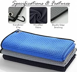 - SlickNik Golf Towels with Microfiber Waffle Pattern uses Orange Petal Technology has new and improved way to take care of your golf equipment. Our golf club cleaning kit of three towels are composition of Microfiber and comfortable cotton material, a perfect combination to clean golf tool. Our waffle golf towel has an attractive and eye-catching colours including Blue, Black, and Grey. It’s not too small golf towel that impossible to hang rather it has perfect size of 16”x16” with a thickness of 400 GSM. This can be very helpful to a golfer during a rain shower, a sweaty/humid afternoon, or when dealing with morning dew. Keep your golf accessories for men clean and dry in any conditions. Our women golf towel with striking and attractive colors for womens golf can easily hands and machine wash, super absorbent of water, easy to dry and re-use to clean the golfing accessories many times. You can attach the golf towel to your golf accessories kit, you can easily take the towel outdoors and just enjoy your golf game time. Our golf towel pack offers a pack with mixed colors black, grey and blue. These soft sports towels can be used to clean your sweat in gym, baseball, tennis, basketball, football and a perfect gift for all sports lovers.