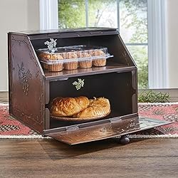 FOREST CHARM DESIGN: Features a pine bough motif with an aged copper finish, bringing elegant woodland appeal to your kitchen decor. AMPLE STORAGE: Includes two shelves inside, perfect for organizing bread, pastries, or other kitchen essentials while keeping them fresh. RUSTIC TURN KNOB: Designed with a vintage-inspired turn knob, providing both functionality and rustic charm. DURABLE METAL CONSTRUCTION: Crafted from high-quality metal for long-lasting use, ideal for a busy kitchen or cabin setting. Dimension: 13"W x 11"D x 11"H