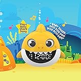 - Update your little one’s nightstand with the Pinkfong Baby Shark Alarm Clock + Bluetooth Speaker. Featuring sleep, play and wake modes, this device sleep trains children and teaches them about rest and quiet hours in an interactive way! Set the desired sleep time and every night, Baby Shark Clock sleeps through the night so your child knows to stay in bed. Set an optional night light to help your little one fall asleep peacefully. Half an hour before the wake time, the clock will open its eyes, glow and start looking around. Teach your kid to play quietly until the light turns green! Set the desired wake time, and Baby Shark Clock will start glowing and singing the Baby Shark song. The green light will stay illuminated for one hour in case your little one sleeps in! With alarm sounds, nature sleep sounds, snooze function and night light, this device is the perfect addition to any child’s room. Features a rechargeable battery and detachable 4’ USB cable for portability and convenience. Suitable for children ages 2+ for night light/sleep sounds; 3+ for all functions.