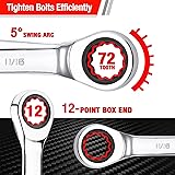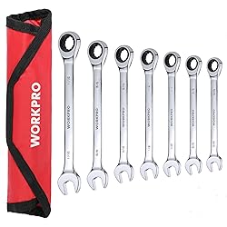 Sturdy and Reliable: This gear ratcheting wrench is forged from high-quality chrome vanadium steel; The wrench hardness up to HRC 50 makes the wrench able to bear more force; The surface is polished and chrome plated and has excellent rust and corrosion resistance Efficient Wrench: The combination wrench has a 12-point box end; To prevent round-off, it contacts and applies force to the flat sides of fastener heads rather than the corners; And combo ratchet wrenches have 72 teeth ratchet, realize 5 degrees swing to help tighten bolts efficiently, and are conveniently suitable for tight spaces 7 Pieces in Standard Size: 7 pieces of standard ratchet wrench sets include 5/16", 3/8", 7/16", 1/2", 9/16", 5/8" and 11/16" combination wrenches, which meet most of your needs; And each wrench has clear dimensioning for quickly identifying the size you need Easy Carry: The ratchet wrench set comes with a premium rolling bag, and each wrench storage bag is marked with the corresponding wrench size to keep all wrenches organized for easy carry and storage Comprehensive Application Scenarios: WORKPRO combination wrench sets have a wide range of application scenarios, including motorcycle repair, auto repair, home projects, bicycle repair, machinery repairs, garage engineering, and so on