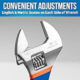 EXTRA WIDE JAWS: Extra wide jaw capacity makes the wrench ideal for a larger variety of nut/bolt sizes, such as pole line hardware and other bigger jobs HIGH DURABILITY: Made of chrome vanadium steel with chrome plated finish and heat treated for maximum strength and durability COMFORTABLE DESIGN: The ergonomic handles are dipped in vinyl for greater comfort and the precision formed worm gear allows smooth operation EASY ADJUSTMENT: English and Metric scales are on each side of the wrench for quick and easy adjustments STANDARDS: This product complies with ASME B107.8-2003 and ASNI standards