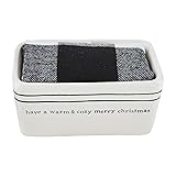 Our Christmas Mini Loaf Set is great for gifting this Christmas! This white ceramic mini loaf dish measures 5.25" x 2.25". The baker reads in black writing "have a warm & cozy merry christmas" with two black stipes. Inside the baker comes rolled a black and white checkered cotton towel that measures 26" x 16.5"