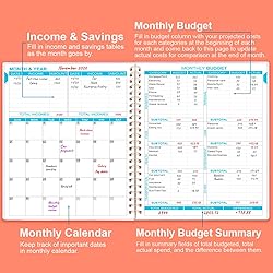 - This undated money planner is 8x9.5 inch, inludes 12 months of financial planning with structured pages for setting financial goals, financial strategy, savings, debts, daily expense, monthly budget, monthly budget review, Christmas budget, summary of the year sections, which is a good finance books, it will help you to take control of your money effectively.This undated budget planner contains:1 financial goals page1 financial strategy page4 saving tracker pages4 debt tracker pages12 months budget planner pages(10 pages per month, 1 unique color for each month). 2 Christmas budgeting pages, 2 yearly summary pages12 notes pages(colleague ruled)This monthly budget planner features high quality 100gsm white paper for easy writing and reducing ink leakage, erase fraying and shade issues, providing clean writing space for your goals, plans and reminders. Sturdy and flexible PP leather covers to protect the inner pages well, thick paper for smooth writing, strong twin-wire binding, sturdy plastic pocket to store loose items, like tickets, cards, papers etc, elastic cloure to protect your planner, all these details demonstrate high quality. This planner is available in 2 different colors, teal and rose.This 12 month budget planner organizer helps you to set monthly goals, budget, review, and develop monthly habits, monetary strategies & action plans. Write down your monthly financial goals, put reminders of bills and payments on the calendar. Use monthly budget section to plan your monthly budget in each expense categories. Track your daily expenses during the month. Review monthly budget at the end of month, reflect on your accomplishments and think about how to do better next month.
