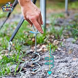 Jump Tastic Trampoline Trampoline Anchors Kit: Include 8Pcs heavy duty bold spiral galvanized steel trampoline anchors and 8Pcs 90'' tie down straps, galvanized steel is more solid, and more long life Trampoline Anchors of Spiral Shaped Design: The trampoline stakes apply spiral shaped design, could grip the earth firmly, reduce trampoline' shake in using, keep safe and extend trampoline's life Easy to Install: 1.Select a suitable place, 2.Twist the trampoline anchors into earth, 3.Connect the trampoline's frame to anchors by using tie down strap. The tie down strap is 90inch, could used for 15ft, 14ft, 12ft and all size of trampoline Multifunctional: The trampoline anchors could be used as Anchors for Trampoline, Anchors for Tent, Anchors for Swingset TIPS: The trampoline anchors would work much better with a moderately soft and hard ground. if you want to install it in special hard ground, please watering the ground, then next morning to install it