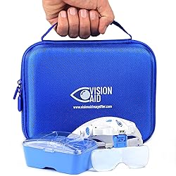 9 Hours Non-Stop LED Light - USB Rechargeable, no batteries are needed. Recharges fast in 30 minutes. Comes with a USB charging cord. 2 Brightness modes. MAKES CLOSE-UP WORK EASY - 5 Magnification Powers: 1.0x, 1.5x, 2x, 2.5x, 3.5x for different projects. A 1.0x magnification power is a 100% increase in the magnified object's size. For example, a 1-inch object at 1.0x would appear to be 2 inches. PROTECTIVE STORAGE CASE - sturdy, keeps magnifying glasses kit organized, great for travelling, protects from damages. FITS OVER GLASSES - can be worn over your prescription glasses for extra magnification. Total weight of the frame - 3 oz. HANDS-FREE MAGNIFIER FOR HOBBIES - miniatures, scale model, dental dentist work, jewelry, diamond painting, crafts, cross-stitch, sewing