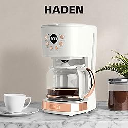 - Upgrade your morning with the HADEN Coffee Machine. Its sleek, durable housing is a hallmark of modern kitchen convenience and its simple beauty is a perfect addition to any countertop. Featuring a 12-cup capacity, this coffee maker is great for coffee lovers and enthusiasts. It nestles beautifully in spaces like offices, apartments, or college dorms and fits perfectly on your kitchen counter. The easy-to-use design includes a programmable clock and functions like Brew Strength for just the right type of brew to start your day, and a Delay Brew setting for coffee-making convenience on your schedule. Rely on the Auto Shut-Off feature that powers the unit off after 120 minutes (about 2 hours) for peace of mind on busy mornings. Pour your hot coffee and serve your guests with ease using the glass coffee pot’s large handle, while the lid helps to control the flow. For ease of maintenance, the machine’s removable water filter can be washed and reused. Inspired by British homes, architecture, and landscapes, this HADEN electric coffee maker features a chic Ivory & Copper color scheme that pairs well with the Heritage Collection to complete your kitchen’s modern styling. The HADEN 12-Cup Programmable Coffee Machine embodies the fusion of innovation and modern functionality. Add this appliance to your kitchen necessities and take your morning coffee experience to the next level.