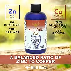- Pico Zinc Plus is a liquid mineral supplement formulated to provide bioavailable zinc and copper in a stabilized ionic form for efficient absorption at the cellular level. Developed using the same proprietary technology behind ReMag and ReMyte, this formula is designed to support essential mineral intake with precision and ease.* Each serving delivers a balanced ratio of zinc and copper, two trace minerals that work together in numerous physiological processes. Zinc lactate provides the foundational mineral needed for protein synthesis, cell division, and DNA integrity. Copper sulfate pentahydrate contributes to connective tissue health and plays a role in blood cell development and antioxidant enzyme function.* Zinc is required for the activity of approximately 100 enzymes involved in metabolic processes. It also supports normal growth and development, skin integrity, immune function, and the maintenance of a healthy sense of taste and smell.* Because the body does not store zinc in significant amounts, regular intake is important. Copper complements zinc by supporting the formation of red and white blood cells, maintaining elasticity in skin tissue, and contributing to energy production through enzymatic pathways.* Pico Zinc Plus is easy to mix with water or your favorite beverage. It is suitable for daily use, made without artificial ingredients, and free from common allergens including gluten, dairy, soy, and yeast. This clean and carefully formulated supplement offers a simple, effective way to reinforce your body’s mineral foundation with zinc and copper in their most efficient ionic forms.*