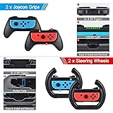 14 in 1 Switch Sports Accessories Bundle: Includes 2 steering wheels, 2 J-Con grips, 2 wrist straps, 2 leg straps, 2 tennis rackets, 2 J-Con golf clubs, and 2 handles. This bundle saves you time and money by providing all the accessories you need Perfect Fit for Switch Sports: This kit is ideal for Switch sports games. The tennis racket works for tennis and badminton, the golf club suits Mario Golf: Super Rush, and the leg strap fits exercises like soccer. Enhance your gaming with realism and fun Versatile 2 in 1 Handle: The detachable handle (X2) makes storing and carrying easy. Anti-skid pads prevent J-Con from popping out, and protective locks ensure the racket stays secure, avoiding damage or injury Improve Gaming Experience: J-Con grips offer traditional controller comfort for games like Super Smash Bros. Steering wheels are perfect for Mario Kart 8 Deluxe. Elastic wrist straps keep your J-Con secure for games like Just Dance and Fitness Boxing A Perfect Gift for Switch Players: This 14-in-1 Switch sports accessories bundle is an ideal gift, enhancing your gaming experience with almost everything you need. Note: Switch console and J-Con are not included
