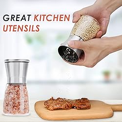 ✅Premium Food Grade Glass and Stainless Steel Cap- Salt and pepper grinder set with food grade transparent glass which is safe and user friendly for easy refill. Stainless Steel grinder cap won't rust and is scratch proof. ✅Perfect Your Cooking with Desired Coarseness- Salt pepper grinder set with adjustable ceramic rotor supporting more than 5 sizes of coarseness. You can grind Himalayan sea salt, peppercorn medley, herbs or other spices you desire. ✅Refillable & Large Capacity - Pepper grinder holds 3/4 cup of the salt, pepper, or spice, avoiding frequent refills. Refillable salt and pepper grinder set’s wide opening ensures that you fill spices easily. We care about design details to satisfy your need and convenience. ✅Lovely Kitchen Tools- EBACO’s Salt &Pepper mill is a modern and classy addition to your kitchen. Perfect for a family meal or dinner party. Ideal gift for any occasions. ✅100% Customer Satisfaction Guarantee- We care about your satisfaction and we wanted to optimize your experience with our product.
