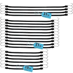 - Product Name: Natural Rubber Tarp Bungee Straps Size: Multiple Size: (2) 31", (4) 21", and (3) 15" length Color: Black Material: EPDM Natural Rubber Quantity: 20Pack FEATURES & BENEFITS: Heavy-Duty Easy to Use Available in many sizes Waterproof and Water Resistant Non-Crimped S-Hooks on Both Ends Flexible (Can Stretch Up to 1.5x Their Original Length and Bounce Back) Long-Lasting and Reusable Works with Vehicles like Cars, Trucks, Vans, RVs and Campers Holds Down Tarps, Canvases and Canopies Perfect for Camping and Traveling Great for Indoor and Outdoor Use