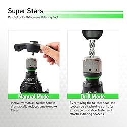 Super Stars Drill/Manual 2 Type Flaring Tool chose large feed screw handle for smooth turning with little effort when flaring. Producing 45° flare 2 Operation Modes: Upgraded Electric Drill Mode is more labor-saving. Manul Mode for convenient use. Suitable for copper, brass, aluminum and mild steel tubing Precise Locating: A perfect combination of location steel bar and location holes embedded on the yoke side, helps you to precise locating and flaring Metric & Inch 2 in 1 Clamp: (Inch: 1/4, 5/16, 3/8, 1/2, 5/8, 3/4; Metric: 6mm, 9mm, 10mm 12mm, 16mm, 19mm) O.D.; Recommended for R410a flare Arc flame with ergonomic design, makes the flare a breeze. Built from the toughest steel and chrome plated which support rugged jobs and precision craftsmanship. Economical choice for refrigeration, heating and air
