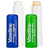 VASELINE LIP BALM: Enjoy two Original and two Aloe Vera lip balm sticks crafted with Vaseline Healing Jelly. HYDRATING LIP BALM: Our lip balm glides over your lips to easily heal and soften dry, cracked lips. ON-THE GO MOISTURIZATION: Wherever you go, take a Vaseline stick with you to help protect your lips from the elements. CONTAINS VITAMIN E: Each formulation contains Vitamin E, a vitamin with humectant properties that helps draw lasting moisture to your lips. TRUST VASELINE: Each formulation is made with Vaseline Jelly, which dermatologists recommend for long-lasting moisturization and lip care.