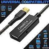 【Important Note】: Including an AC power supply (5V 2A), you can use our power to make the extension cable has extra power to supply when the equipment needs large power or connecting a long cable. This extension cable not suitable for extended video and charging devices. The led light indicates power status. 【USB Active Extender】: This USB extender has different lengths (from 50ft to 150ft), which can help you choose the correct one for your daily life and office work. Provides an easy and inexpensive way to extends the USB connection to your computer or USB peripherals. Compatible with printer, game console, scanner, camera, keyboard, mouse, Hard drive, flash drive and more. 【Stable Data Transmission】: The maximum data transmission speed of this USB active repeater cable is up to 480mbps. Our cable has 3 extended chipset signal amplifiers to ensure uninterrupted signal transmission and stable speed when USB devices are used on this longer cable than other usb extension cable. Each integrated amplification chipset with an extra port for optional AC power adapter (5V 2A), so you can insert the one closest to the plug when you need it. 【A Wholly-new Design】: Our usb extension male to female cable featuring the high quality 22AWG tinned (stronger corrosion resistance and oxidation resistance than pure copper) copper wire. The reinforced molded strain relief (SR) design makes the cable more durable. The combination of flexible and tensile PVC jacket, gold-plated connectors, foil and braid shielding provides superior cable performance and stable signal transmission. 【Worry-free Service】: We hope our product can create a perfect experience for you and offer a two-year warranty. If you have any questions about our products, you can contact us at any time, and our professional customer service will reply within 24 hours. Package: 1 pack USB 2.0 extension cable, an AC power adapter and 5 pcs cable ties.