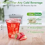 - LILYMICKY 100 SETS 12 OZ CLEAR PLASTIC CUPS WITH STRAWLESS SIP LIDS: ✓We are committed to providing wide variety of disposable plastic products to facilitate your life and making you enjoy yourself. BEST CHOOSE FOR DRINKS: 1.Made of high quality flexible plastic, upgraded and thickened, designed with rolled edges for a smooth finish. 2.Durable and steady, cups with lids are leak tightness,perfect for on-the-go use.Impact resistant and crack resistant. Better quality and more reliable than others. 3.Crystal clear appearance can shows beautiful colors and the crystal bubbles of various drinks, such as coffee, smoothies, shakes, juice, bubble boba, lemonade, sodas yogurt, parfait and more. PACKAGE INCLUDE: 100 × 12 oz clear plastic cup 100 × strawless sip lids CAUTIONS : ☆ The PET plastic cups are only suitable for cold or room temperature drinks and food. ☆ Do not put hot coffee or other hot drinks in these 12 oz cold drinks cups or put them in the microwave or dishwasher.